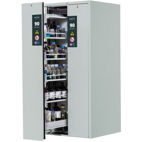Todo laboratorio en el que habitualmente se permanece en contacto diario con productos químicos debe tener por seguridad, recogido en la legislación actual, un lugar de almacenamiento obligatorio según Norma. El objetivo de un Armario de seguridad es la protección del personal, productos e instalaciones. Disponemos de un importante stock de armarios para entrega inmediata Inflamables, Ácidos/bases y Fitosanitarios, con cumplimiento de normativas EN 14470-1 (Tipo 90 minutos de resistencia al fuego), conformidad CE, vehículos apropiados (tamaño, capacidad, potencia y puerta trasera elevadora) para transporte y colocación en lugar accesible con transpaletas, para pisos montacargas del cliente. Conductos de aire integrados listos p/conectar al sistema de extracción, no incluido en todos los modelos. Conexión al exterior, ventilador o salida directa chimenea, no incluida.